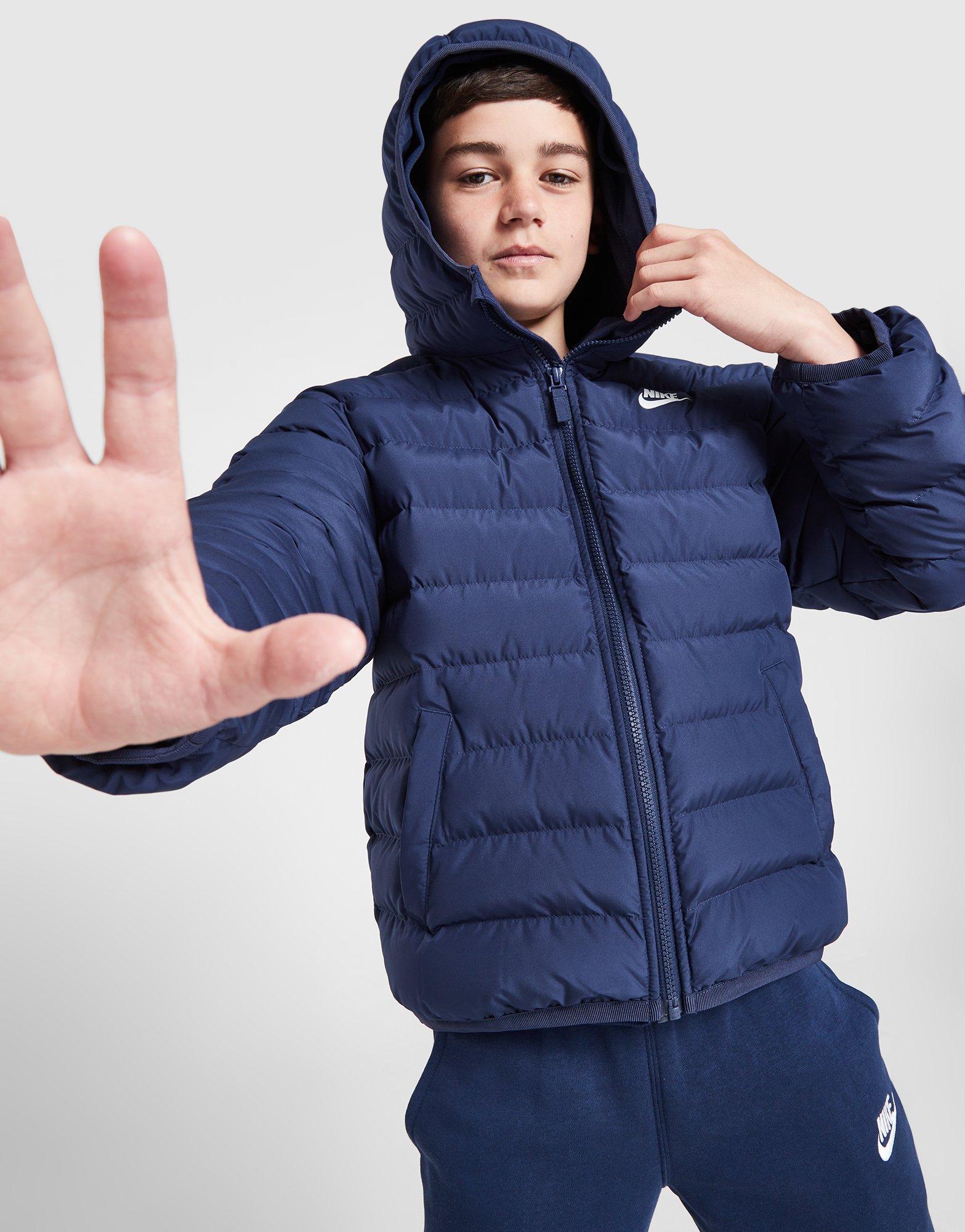 Zapewnij sobie niezbędny komfort termiczny w juniorskiej kurtce Synthetic Padded Jacket marki Nike. Model w granatowej kolorystyce został wykonany z gładkiego poliestru, a jego lekkie wypełnienie zapewni ciepło i komfort. Produkt jest zapinany na zamek, ma kaptur oraz praktyczne kieszenie po bokach. Projekt wieńczy logo Swoosh na klatce piersiowej. Można prać w pralce.